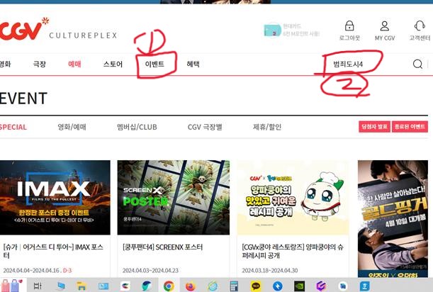 ⭐ 그러면 스크롤 맨 밑으로 내리면 CGV 회원시사 이벤트가 나올 거예요! 클릭해주세요!