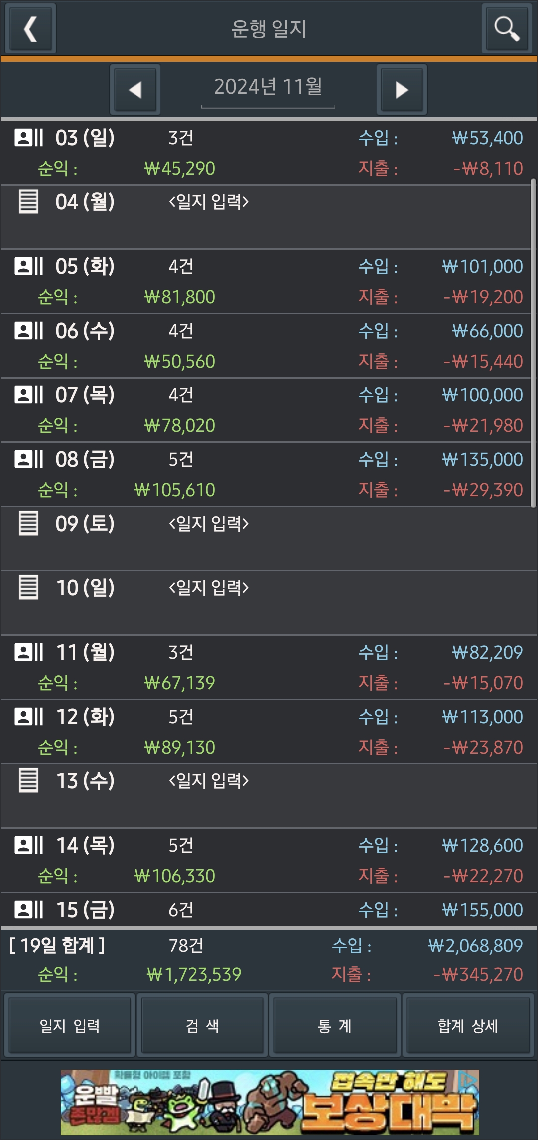 🌸 대리기사님들의 다른 필수 어플인! 대리 가계부 어플 입니다! 그 날 하루 순익이 얼만지, 매출이 얼마고, 지출이 얼마 인지 한눈에 확인이 가능한 어플입니다.